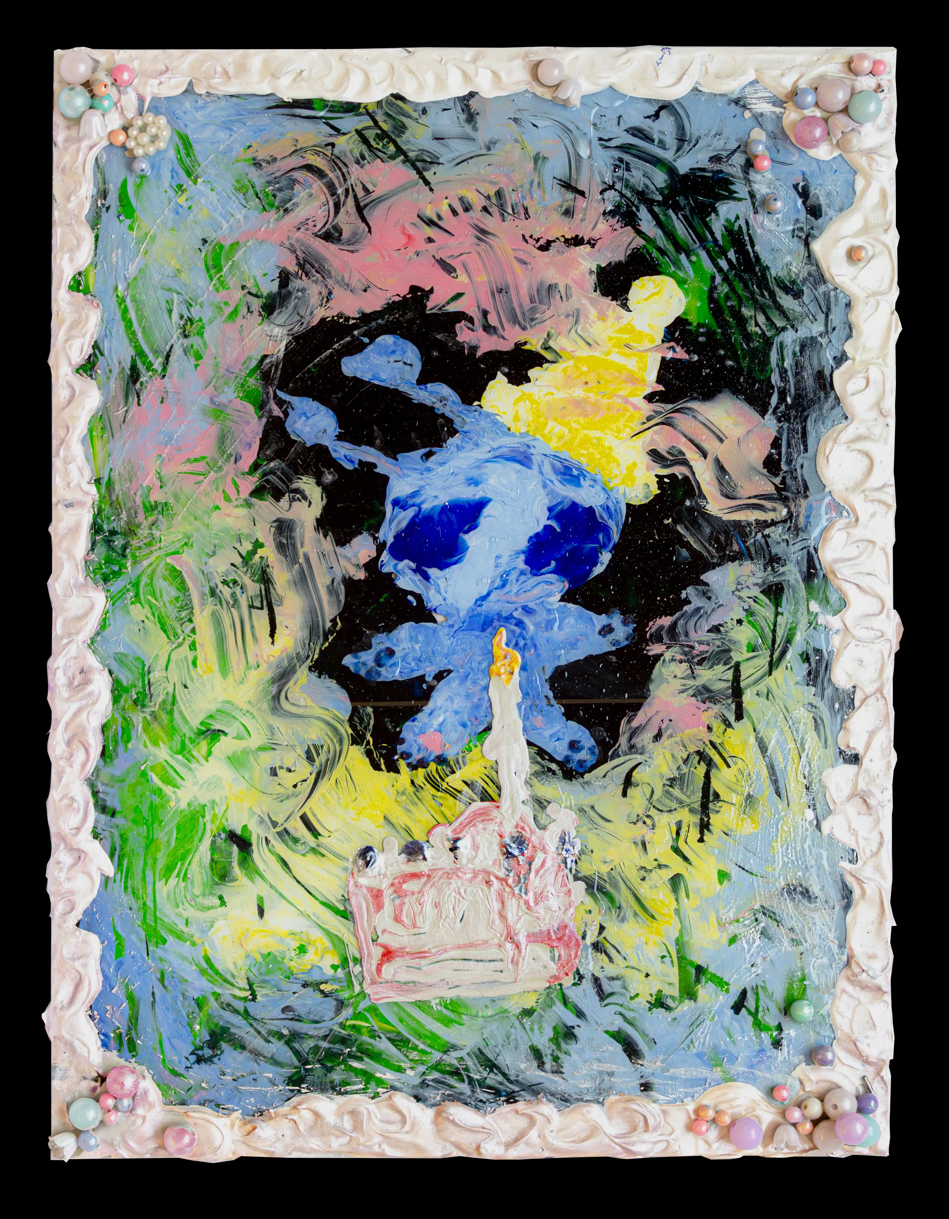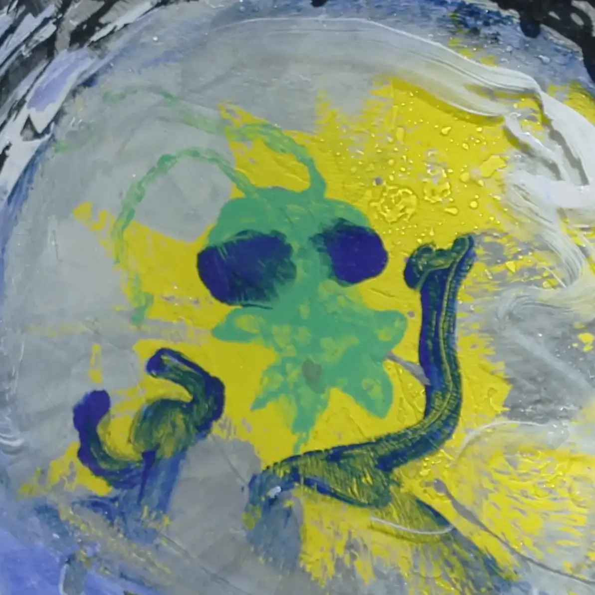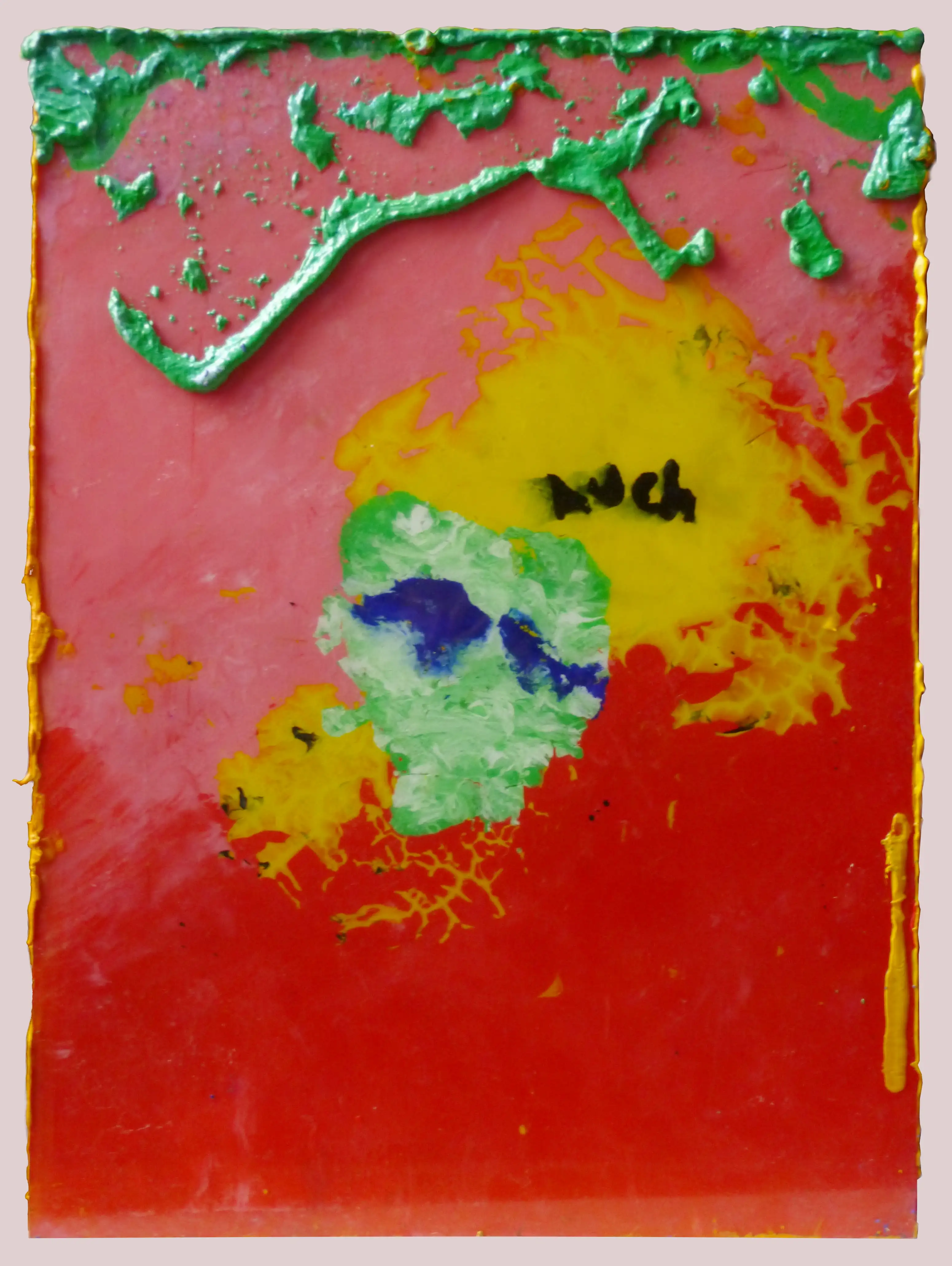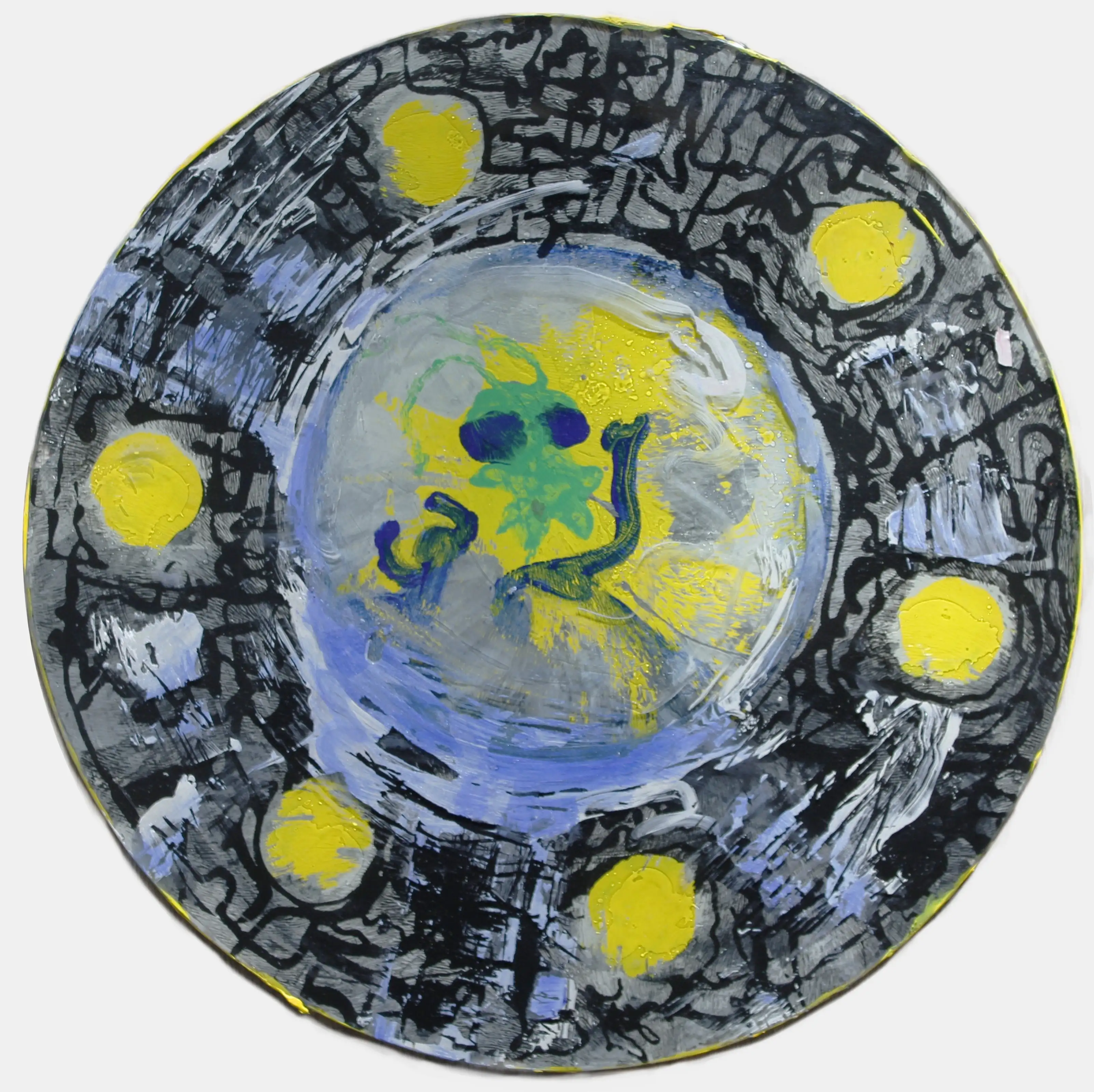 He aquí una serie de pinturas de alienígenas pequeños, aplastados contra vidrios. Son coloridos y completamente miserables. Están, en parte, basados en mi propia inhabilidad como autista de integrarme en el flujo normal de la vida, de ser visto en el mejor de los casos como una curiosidad llamativa y en el peor de los casos como un ser desechable. Materialmente, me interesa llegar los extremos de volumen y densidad que ofrece la pintura acrílica.